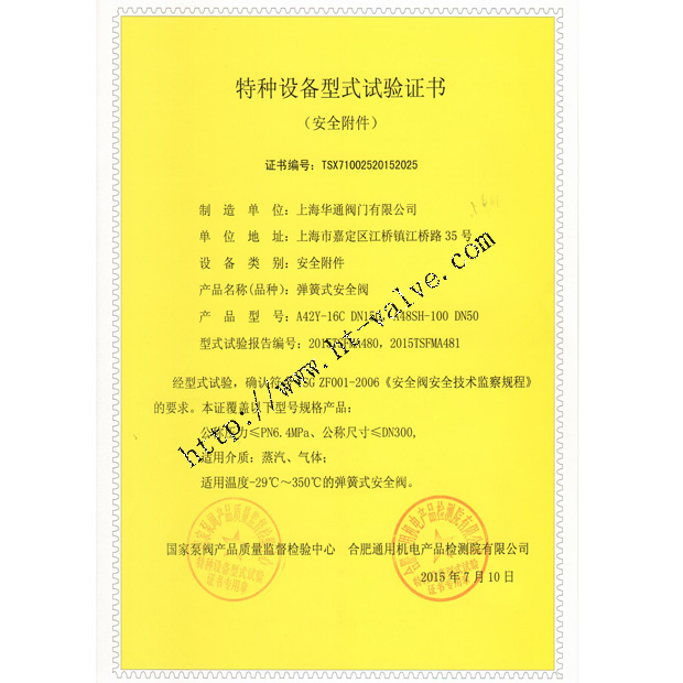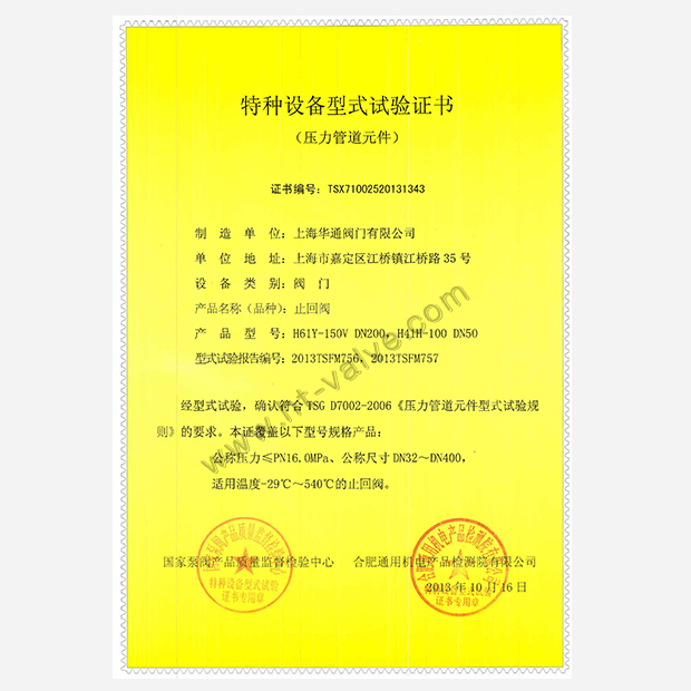 闸阀特种设备型式试验证书
