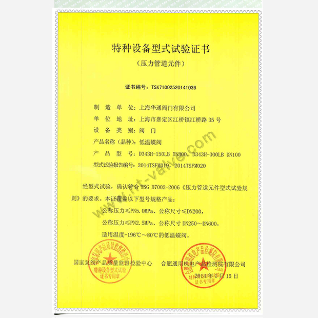 低温蝶阀特种设备型式试验证书