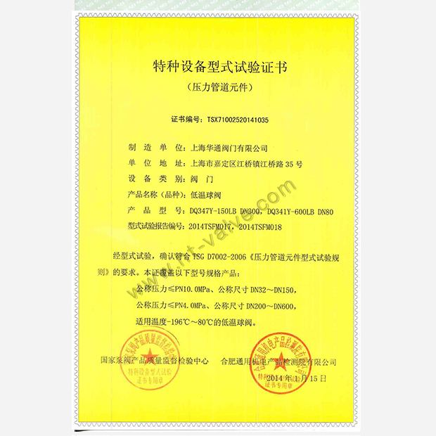低温球阀特种设备型式试验证书