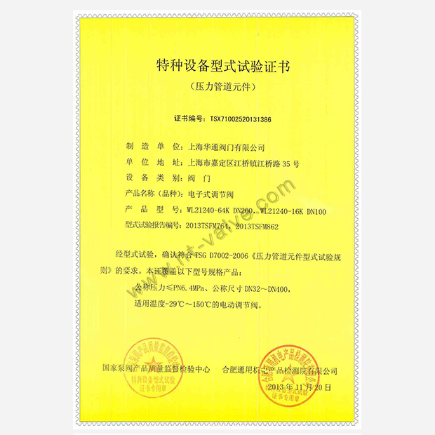 气动调节阀特种设备型式试验证书